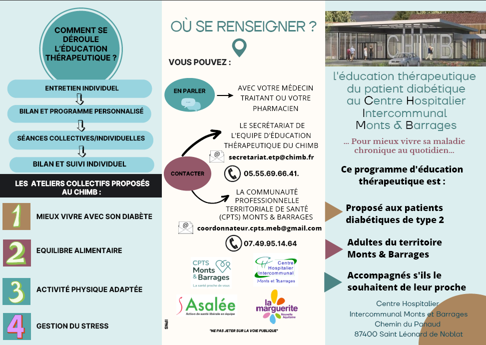 Ce programme d’éducation thérapeutique est proposé aux patients diabétique de type 2, aux adultes du territoire Monts et Barrages. Les patients peuvent être accompagnés de leur proches;